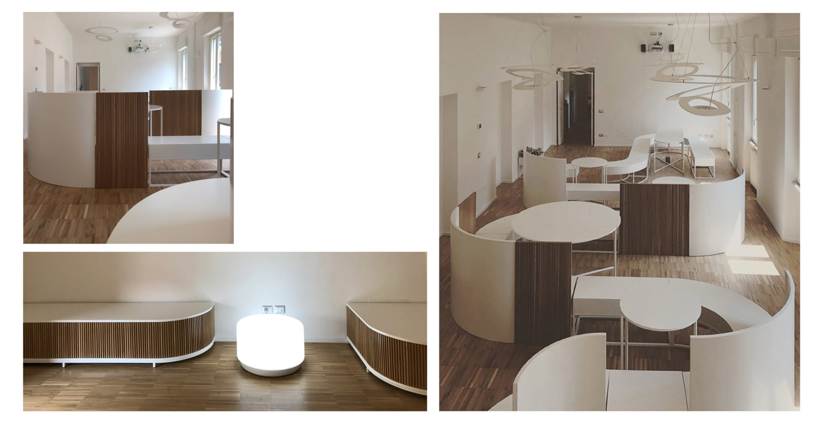 An open space, free from internal partitions, hosts a series of bespoke modular furnishings that flow through the space, creating an immersive and functional environment, ideal for both conference rooms and collaborative workgroups.