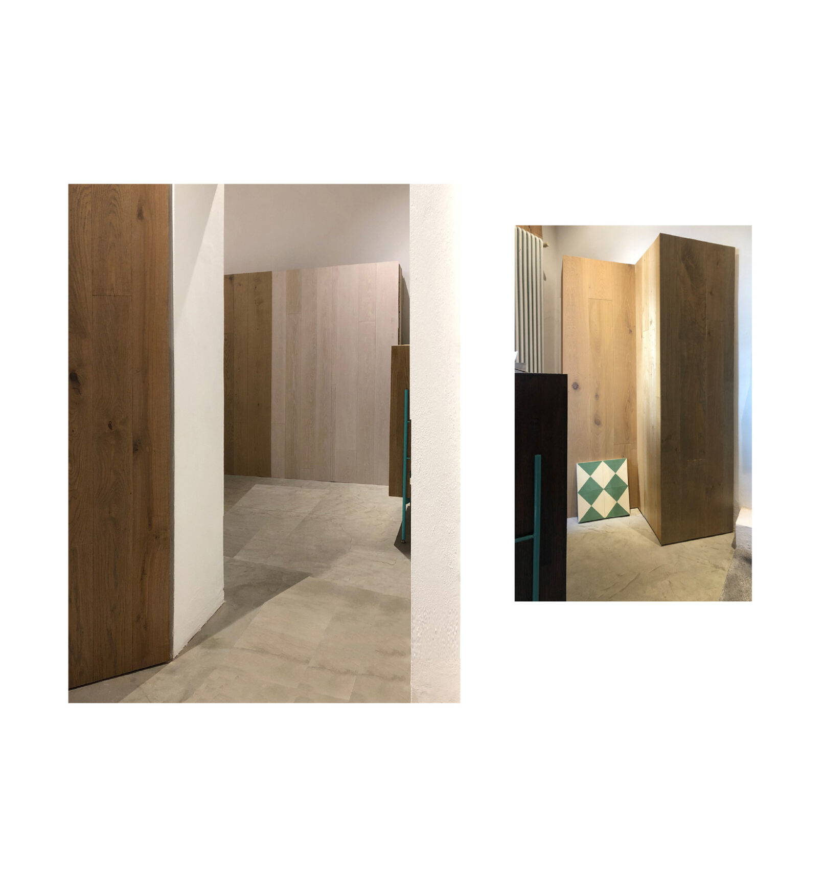 The retail spaces oscillate between the seriality of optical finishes and the artisanal luxury of custom-designed zigzag wooden screens, which serve both as storage units and material showcases for the showroom.